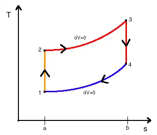 Nas etapas 1-2 e 3-4 (diagrama TxS, temperatura versus entropia) é realizado trabalho mas como processo é adiabático processo termodinâmico onde não ocorrem transferência de calor. Durante as etapas 2-3 e 4-1 os processos térmicos são isocóricos, ou seja, a transferência de calor ocorre mas nenhum trabalho é efetuado. O trabalho é realizado durante um processo térmico isocórico é zero porque para ocorrer o trabalho necessita que se tenha uma variação no volume. Partindo da equação do rendimento térmico conforme o demostrado acima: