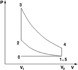 o estágio de admissão (0-1) é realizado por um processo isobárico de expansão, seguido por processo adiabático de  compressão . Através da combustão do combustível, calor é adicionado em um processo isocórico, seguido por um processo adiabático de expansão, caracterizando o ciclo de  força . O ciclo é fechado pela  exaustão , caracterizada por processo de refrigeração isocórica e compressão isobárica.