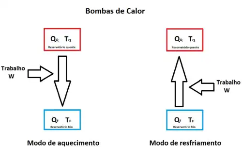 A direção natural de transferência de energia é do reservatório quente (Qq, a uma temperatura Tq) para o reservatório frio (Qf, a uma temperatura Tf). A função das bombas de calor e refrigeradores é realizar a transferência de energia do reservatório frio para o reservatório quente, com o auxílio de uma fonte de trabalho externa.[2]