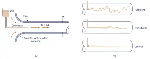 Reynolds, a fim de observar o comportamento dos líquidos em escoamento, empregou o dispositivo mostrado na Figura 1, esquematicamente apresentado na Figura 2(a), que consiste em um tubo transparente inserido em um recipiente com paredes de vidro. A entrada do tubo, alargada em forma de sino, evita turbulências parasitas.[5]