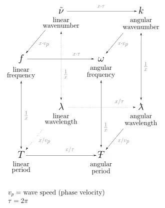 O comprimento de onda λ tem uma relação inversa com a frequência[3] f, a velocidade de repetição de qualquer fenômeno periódico. O comprimento de onda é igual à velocidade da onda dividida pela frequência da onda. Quando se lida com radiação electromagnética no vácuo, essa velocidade é igual à velocidade da luz 'c', para sinais (ondas) no ar, essa velocidade é a velocidade na qual a onda viaja.