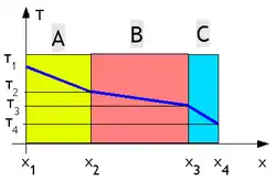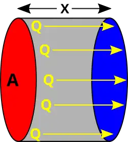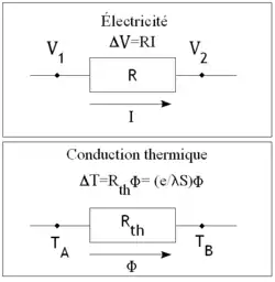 O calor transferido é tratado pela lei de Fourier que descreve especificamente previsões (modelagens) de comportamento para o caso simples de um corpo sólido, com duas paredes paralelas:[15][16]