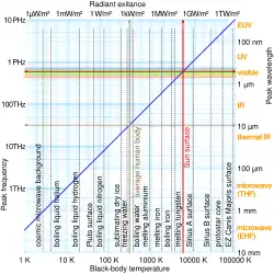 O comprimento de onda na qual a radiação é máxima é dada pela Lei de Wien e a potência total emitida por unidade de área é dada pela Lei de Stefan-Boltzmann. Então, a temperatura aumenta, a cor muda de vermelho para amarelo para branco para azul. Mesmo que o pico do comprimento de onda mova-se para o ultravioleta, a radiação continua sendo emitida no comprimento de onda do azul.