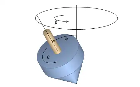 Nesse caso, dois dos ângulos, e , variam em função do tempo e, portanto, há duas velocidades angulares, e .