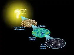 Na Inflação cósmica, o espaço está expandindo por uma ordem de fatores em 1026 sobre uma ordem temporal de 10−33 até 10−32 segundos. O universo é super-esfriamento em cerca de 1027 caindo para 1022 kelvins.[12] A força forte torna-se separada pela força eletrofraca. | |