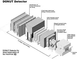 No DONUT, prótons acelerados pelo Tevatron foram utilizados na produção de neutrinos do tau através do decaimento de mésons charm. Após a eliminação de todas quanto possível partículas indesejadas no pano de fundo por um sistema de ímãs e matéria condensada (principalmente aço e concreto), a radiação passou por diversas camadas de detectores de partículas. Em raros casos um dos neutrinos interagiram com o detector, produzindo partículas eletricamente carregadas que deixavam traços visíveis no detector e puderam ser registrados eletronicamente por um sistema de cintiladores e câmaras multifios.[1]
