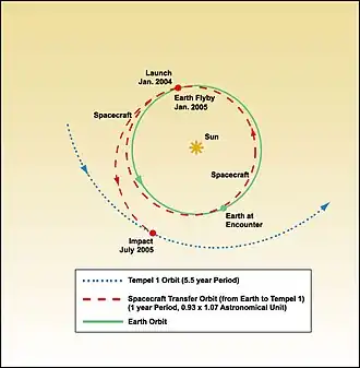A sonda viajará por seis meses, 431 milhões de quilômetros até o cometa Tempel 1, colidindo em 4 de julho de 2005, com uma velocidade de 37 000 km/h.