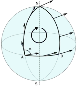 O caminho mais curto implica uma mudança contínua de curso ao longo do caminho, se definirmos curso como um ângulo em relação ao norte. Portanto, uma direção "constante" no sentido de seguir o caminho mais curto, implica, em geral, um vetor velocidade variável (ângulo variável em relação ao norte) numa superfície curva como a da terra. Os termos adicionados à derivada parcial no cálculo da derivada covariante, permitem que esse curso "reto" tenha derivada zero, ou seja, velocidade constante, corrigindo os desvios aparentes oriundos do sistema de coordenadas.[1]