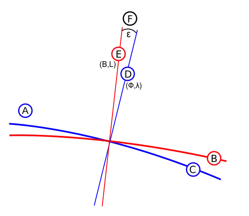 Em geral, este ângulo é diferente de zero, mas isto não exclui que em certos locais (Monte Mario para Itália) a vertical coincida com a normal ao geoide, pelo que o ângulo de desvio da vertical é zero e o elipsoide pode ser substituído pelo geoide. Operacionalmente, as coordenadas geográficas, detectadas astronomicamente, são feitas coincidir com as coordenadas do elipsoide. Por fim, para orientar localmente o elipsoide, mede-se um azimute astronómico e impõe-se um azimute igual ao azimute do elipsoide.