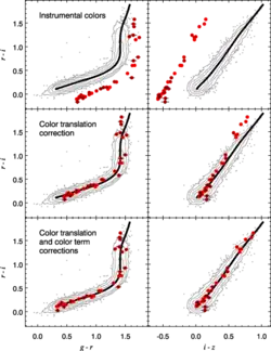 O diagrama cor-cor das estrelas pode ser usado para calibrar diretamente ou testar as cores e em dados de imagens óticas e de infravermelho. Tais métodos tiram proveito da distribuição fundamental das cores estelares na Via Láctea ao longo de quase todo o céu, e o fato de que cores estelares observadas (diferentemente da magnitude aparente) independem da distância das estrelas. A regressão do loco estelar (RLE)[1] foi um método desenvolvido para eliminar a necessidade de observações de velas-padrão em calibragens fotométricas, exceto, muito raramente (uma vez ao ano ou menos) para medir termos de cor. A RLE tem sido utilizada em várias iniciativas de pesquisa. O recenseamento astronômico NEWFIRM da região NOAO Deep Wide-Field Survey utilizou esse método para chegar a cores mais apuradas do que seria possível em métodos de calibragem tradicionais, e o Telescópio Polo Sul utilizou a RLE para medir o desvio para o vermelho dos aglomerados de galáxias.[2] O método blue-tip[3] é bem semelhante ao método RLE, mas era utilizado primariamente para corrigir previsões sobre a extinção galática baseadas em dados do IRAS. Outras pesquisas de mapeamento que utilizaram o diagrama cor-cor basicamente como uma ferramenta de calibragem incluem o Oxford-Dartmouth Thirty Degree Survey[4] e o Sloan Digital Sky Survey (SDSS).[5]