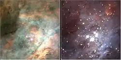 Diagramas cor-cor são comumente utilizados na astronomia em infravermelho para estudar as regiões formadoras de estrelas. As estrelas se formam em nuvens de poeira. Na medida em que a estrela continua se contraindo, um disco circum-estelar se forma, e esta poeira é então aquecida pela estrela central. A poeira então começa a radiar como um corpo escuro, apesar de ser bem mais fria que a estrela. Como resultado, um excesso de infravermelho é observado nessa estrela. Mesmo sem a presença de poeira circum-estelar, as regiões onde ocorre a formação de estrelas exibem alta luminosidade infravermelha em relação às estrelas da sequência principal.[10] Ambos os efeitos são distintos do avermelhamento da luz estelar que ocorre com resultado da dispersão da poeira no meio interestelar.
