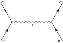 Um processo usualmente utilizado para ilustrar o funcionamento dos diagramas de Feynman é o efeito Compton, onde um elétron e um fóton sofrem um espalhamento elástico (). Neste diagrama, ambos os vértices tem como entrada um elétron real e um fóton real. O elétron absorve o fóton (à esquerda), emitindo um outro fóton (de frequência menor) posteriormente (à direita). Outra maneira de interpretar o processo é considerar que, à esquerda, um fóton e um elétron se aniquilam criando um elétron virtual com diferença na massa e na energia em relação ao elétron inicial. Este elétron tem um tempo de vida muito curto, não violando o princípio da incerteza relativo à energia e tempo. Em seguida, o elétron virtual é aniquilado, dando origem a um fóton e um elétron que caracterizam as partículas que compõem o estado final.