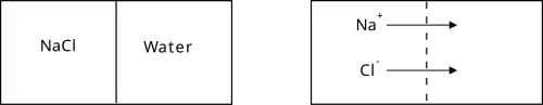 Exemplo de difusão química (clássica, de Fick, ou de Fickian) de cloreto de sódio em água.