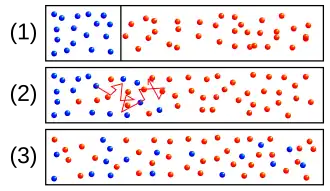 A difusão de pontos de vista microscópico e macroscópico. Inicialmente, existem moléculas de soluto ao lado esquerdo da barreira (linha púrpura) e nenhuma no lado direito. A barreira é removida, e o soluto difunde-se preenchendo inteiramente o recipiente. No topo: Uma única molécula move-se aleatoriamente. Centro: Com mais moléculas, há uma tendência clara, na qual o soluto enche o recipiente mais e mais uniformemente. Abaixo: Com um enorme número de moléculas de soluto, toda a aleatoriedade se vai: O soluto parece mover-se suave e sistematicamente das áreas de alta concentração para áreas de baixa concentração, seguindo as leis de Fick.