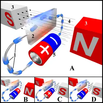 Na figura "A", o elemento Hall recebe uma carga negativa na extremidade superior (simbolizado pela cor azul) e uma positiva na extremidade inferior (cor vermelha). Em "B" e "C", tanto a corrente elétrica ou o campo magnético são revertidos, causando a polarização reversa. Invertendo ambas corrente e campo magnético (figura "D") faz com que o elemento Hall novamente assuma a carga negativa na extremidade superior.