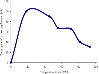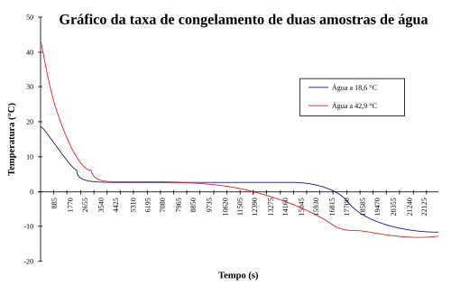 - Superfusão: Há a hipótese de que a água fria, quando colocada em um ambiente abaixo de 0 °C superfunde-se mais do que a água quente no mesmo ambiente, solidificando-se mais devagar do que a água quente.[12][13] Porém, a superfusão tende a ser menos significante onde há partículas que agem como núcleos para os cristais, então precipitando um congelamento rápido.