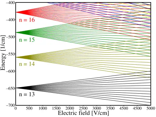 O efeito Stark pode conduzir à divisão dos níveis de energia degenerados. Por exemplo, no modelo de Bohr, um elétron tem a mesma energia se está no estado 2s ou em qualquer um dos estados 2p. Entretanto, num campo elétrico, existirão orbitais híbridos (também chamados superposições quânticas) de energia e outros orbitais híbridos onde o elétron tende à direita, no qual ele adquire uma maior energia. Portanto, os níveis de energia primeiramente degenerados vão se dividir em níveis de energia superficialmente mais baixos e mais fortes.