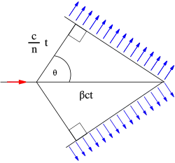 Na figura sobre a geometria, a partícula (seta vermelha) viaja em um meio com velocidade tal que  onde é a velocidade da luz no vácuo e é o índice de refração do meio. Se o meio for água, a condição é , pois para a água a 20 °C.