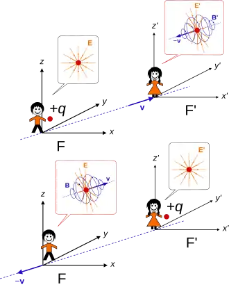 O quadro de referência escolhido determina se um fenômeno eletromagnético é visto como um efeito magnético ou elétrico ou uma combinação dos dois. Os autores geralmente derivam o magnetismo da eletrostática quando a relatividade especial e a invariância de carga [en] são levadas em consideração. The Feynman lectures on physics (vol. 2, cap. 13–6) usa este método para derivar a força magnética na carga em movimento paralelo próximo a um fio condutor de corrente. Ver também Haskell[8] e Landau.[9]