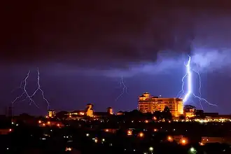 Tempestade de raios em Campinas - SP. A energia potencial elétrica para o sistema onde uma grande quantidade de cargas elétricas encontra-se acumuladas nas nuvens é maior do que a energia potencial elétrica associada ao sistema onde estas cargas encontram-se no solo. Satisfeitas as condições necessárias, uma corrente elétrica estabelece-se através da atmosfera, e estas cargas deslocam-se da nuvem para o solo. A energia potencial liberada neste processo converte-se, entre outras, em energia radiante - que dá origem à luz visível no evento - e em energia térmica - que aquece o ar nas proximidades da corrente. Parte desta energia acaba dá origem a uma onda de choque, que propaga-se pela atmosfera formando o trovão.