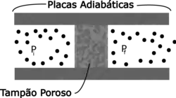 Com a finalidade de se aplicar a 1ª Lei da Termodinâmica, supõe-se que uma certa massa de gás está localizada entre o tampão e um pistão adiabático, que sofre uma pressão inicial Pi e possui um volume inicial Vi. No lado direito, há outro pistão adiabático, sobre o qual é exercido uma pressão Pf. Sendo Pi maior que Pf, os pistões deslocam-se para a direita e o gás atravessa o tampão. Quando toda a massa tiver passado pela parede porosa, o gás ocupará um volume final Vf. [3] É possível observar a representação do aparato ao lado.