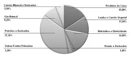 Estrutura da participação de diversas fontes de energia no Brasil. Dados 2007.