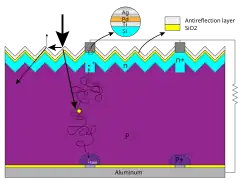 - A capa inferior da célula, que se compõe de silício dopado de tipo p.[notas 4]Esta capa tem portanto uma quantidade média de elétrons livres menor que uma capa de silício puro. Os elétrons estão unidos à rede cristalina que, em consequência, é eletricamente neutra mas apresenta lacunas, positivas (p). A condução elétrica está assegurada por estes portadores de carga, que se deslocam por todo o material.