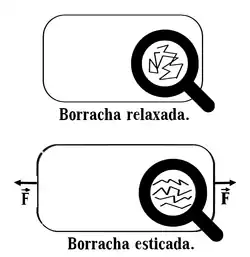 Podemos sentir o efeito da entropia ao esticarmos um elástico, por exemplo. A borracha é formada por longas cadeias de polímeros com ligações cruzadas – que lembram ziguezagues. Quando o elástico está relaxado essas cadeias estão parcialmente enroladas e ordenadas aleatoriamente, devido a esse alto grau de desordem das moléculas o estado possui um valor de entropia também alto. Ao esticarmos o elástico desenrolamos essas moléculas e as alinhamos, como o alinhamento diminui a desordem isso significa dizer que a derivada se torna negativa e consequentemente a força exercida pelos polímeros se torna positiva. Essa força se deve a tendência das moléculas de voltar ao estado menos ordenado (com uma maior entropia).