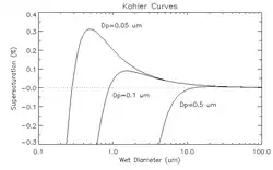 A figura acima mostra três curvas Köhler referentes ao cloreto de sódio. Considere (para gotas contendo soluto com diâmetro igual a 0,05 micrômetros) um ponto no gráfico onde o diâmetro úmido é 0,1 micrômetros e a supersaturação é 0,35%. Como a umidade relativa está acima de 100%, a gota crescerá até que esteja em equilíbrio termodinâmico. Nesse caso, a gota cresce sem que chegue a alcançar o equilíbrio e, portanto, seu crescimento é ilimitado. Contudo, se a supersaturação for de apenas 0,3%, a gota crescerá apenas até cerca de 0,5 micrômetros. A supersaturação na qual a gota crescerá sem limite é chamada de supersaturação crítica e o diâmetro no qual a curva atinge o pico é chamado de diâmetro crítico.