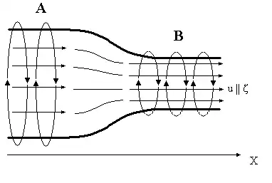 Considere um fluido ideal, com densidade constante e sem viscosidade, movendo-se em um tubo ideal perfeitamente liso colocado ao longo do eixo x. O movimento é estacionário: o fluido se move com velocidade u ao longo do eixo x e gira sobre si mesmo no plano yz. Por conveniência consideramos que, para cada seção vertical de espessura infinitesimal à direita, o movimento rotativo ocorre com velocidade angular ω igual em toda a seção. Então cada seção vertical se move para a direita com velocidade u(x), e gira sobre si mesmo com velocidade angular ω(x).