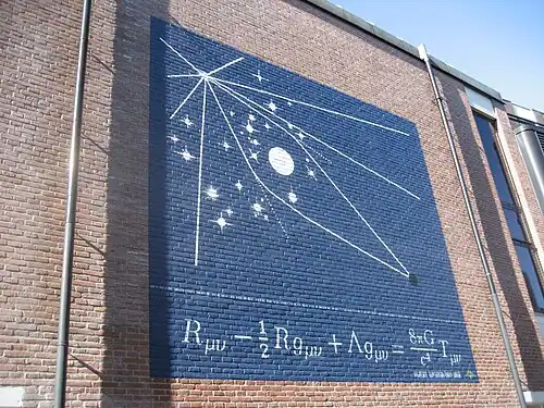 - ↑ Com a escolha da constante gravitacional de Einstein como dada aqui, κ = 8πG/c4, o tensor de tensão e energia no lado direito da equação deve ser escrito com cada componente em unidades de densidade de energia (ou seja, energia por volume, pressão equivalente). Na publicação original de Einstein, a escolha é κ = 8πG/c2, em cujo caso os componentes do tensor de tensão e energia têm unidades de densidade de massa.