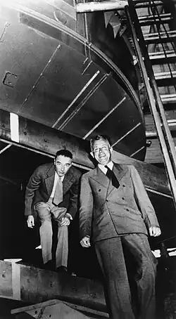 Em setembro de 1941, Oliphant se reuniu com Lawrence e Oppenheimer, em Berkeley, onde lhe mostrou o local para o novo cíclotron de 184 polegadas (4,7 metros). Oliphant por sua vez, levou os americanos a tarefa de não seguirem as recomendações do Comitê MAUD no Reino Unido, que defendia um programa para desenvolver uma bomba atômica.[59] Lawrence já tinha pensado sobre o problema de separar o isótopo físsil de urânio-235 do urânio-238, um processo hoje conhecido como enriquecimento de urânio. Separar isótopos de urânio foi difícil porque os dois isótopos têm propriedades químicas quase idênticas, e só podem ser separados utilizando gradualmente pequenas diferenças de massa. A separação desses isótopos com um espectrômetro de massa foi uma técnica em que Oliphant foi pioneiro com lítio em 1934.[60] Lawrence começou a converter o seu velho cíclotron de 37 polegadas em um espectrômetro de massa gigante.[61] Em sua recomendação ao diretor do Projeto Manhattan, o brigadeiro-general Leslie R. Groves Jr., Oppenheimer foi nomeado como chefe do Laboratório Nacional Los Alamos.[62]