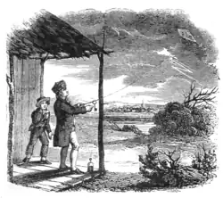 ![]() Benjamin Franklin e William Franklin realizando a experiência, retratados numa ilustração de 1840. | |