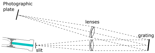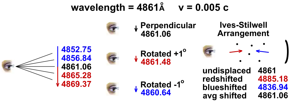 A assimetria das linhas deslocadas por Doppler em relação à linha de emissão central não deslocada não é evidente à inspeção casual, mas requer extrema precisão de medição com atenção cuidadosa às fontes de erro sistemático. Em seu arranjo óptico, ilustrado na Fig. 2, o deslocamento de primeira ordem (Doppler clássico) das emissões de íons H2+ a 20 000 volts era cerca de 2 mm. O deslocamento de segunda ordem esperado do centro de gravidade das visões direta e refletida das emissões era apenas cerca de 0,005 mm, o que correspondia a 0,05 Å, exigindo precisões de medição de vários décimos de mícron.[1]