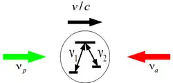com como frequência do feixe de laser propagando antiparalelo ao feixe de íons e como frequência do feixe de laser propagando paralelo ao feixe de íons. e são as frequências de transição das transições em repouso. com como velocidade do íon e como velocidade da luz. No caso da espectroscopia de saturação, a fórmula muda para