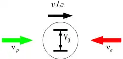 onde é o fator de Lorentz. A relatividade especial, portanto, prevê que o centro de gravidade das linhas de emissão deslocadas por Doppler emitidas por uma fonte movendo-se em direção a um observador e sua imagem refletida afastando-se do observador será deslocado das linhas de emissão não deslocadas por uma quantidade igual ao efeito Doppler transversal.[11][12]