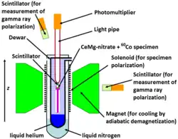 O sal foi magnetizado ao longo do eixo de alto fator g e a temperatura foi reduzida para 1,2K ao bombear o hélio para baixa pressão. O desligamento do campo magnético horizontal resultou na diminuição da temperatura para cerca de 0,003K. O ímã horizontal foi aberto, permitindo espaço para um solenóide vertical ser introduzido e ligado para alinhar os núcleos de cobalto para cima ou para baixo. Apenas um aumento desprezível na temperatura foi causado pelo campo magnético do solenóide, uma vez que a orientação dele estava na direção do fator g baixo. Este método de alcançar alta polarização de núcleos de 60Co foi originado por Gorter[13] e Rose.[14]
