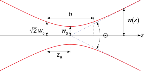 Em uma posição z ao longo do feixe (medido a partir do foco), o parâmetro tamanho da cintura w é dado por[4]