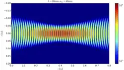 A intensidade de pico em uma distância axial da largura do feixe pode ser calculada como o limite da potência delimitada com um círculo de raio , dividida pela área do círculo quando este encolhe ( tende a zero):