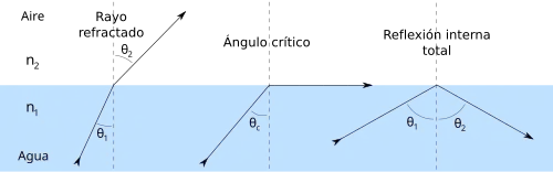 A reflexão total é um fenômeno óptico que se apresenta quando a luz incidente sobre uma superfície que separa dois meios, no sentido do maior para o menor índice de refração, tem reflexão total. Esse fenômeno só possível se o ângulo de incidência for maior que o ângulo limite.