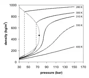 As figuras 1 e 2 mostram projeções de diagramas de fase. No diagrama de fase de pressão por temperatura (Fig. 1) as fases líquida e gasosa são separadas pela ebulição até o ponto crítico, onde essas duas fases somem e viram uma única fase supercrítica. Isso pode ser observado no diagrama de fase de pressão por densidade do dióxido de carbono, como mostra a Figura 2. Bem abaixo da temperatura crítica, como, por exemplo, à 280K, conforme a pressão aumenta, o gás é comprimido e eventualmente, a apenas 40 bar, condensa em um líquido muito mais denso, resultando na descontinuidade na linha (linha vertical pontilhada). O sistema consiste de duas fases em equilíbrio, um líquido de alta densidade e um gás de baixa densidade. Conforme se chega próximo à temperatura crítica (300K), a densidade do gás em equilíbrio se torna maior e a do líquido menor. No ponto crítico, (304.1 K e 7.38 MPa (73.8 bar)) não há diferença na densidade, e as duas fases se tornam uma única fase fluida. Portanto, acima da temperatura crítica, um gás não pode ser liquefeito através de pressão. Um pouco acima da temperatura crítica (310K), nas proximidades da pressão crítica, a linha é quase vertical. Um pequeno incremento na pressão causa um grande aumento na densidade da fase supercrítica. Muitas outras propriedades física também mostram grandes gradientes com a pressão perto do ponto crítico, como por exemplo, a viscosidade, a constante dielétrica e a força do solvente, que são intimamente relacionados com a densidade. Em temperaturas mais altas, o fluido começa a se comportar como um gás, como pode ser visto na Figura 2. Para o dióxido de carbono, a 400K, a densidade aumenta quase linearmente com a pressão.