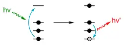 Onde é a constante de Planck e é a frequência do fóton. Essa energia é igual a diferença de energia das camadas eletrônicas, e não a recebida pelo átomo. Logo, ao receber radiação de alta frequência, o material retorna sua própria radiação, mas em outra frequência. Em geral, esse fenômeno de re-emissão de radiação (em menor frequência) por um material é denominado fluorescência.