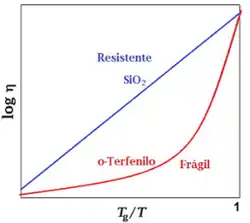 Segundo a classificação de Angell os líquidos "resistentes" apresentam viscosidades (ou tempos de relaxamento dielétrico, por exemplo) com comportamentos do tipo Arrhenius frente à temperatura. A sílica (SiO2) é um exemplo clássico de um "líquido resistente" enquanto que o o-terfenilo é o exemplo típico de um "líquido frágil", formador de vidros frágeis.[8]