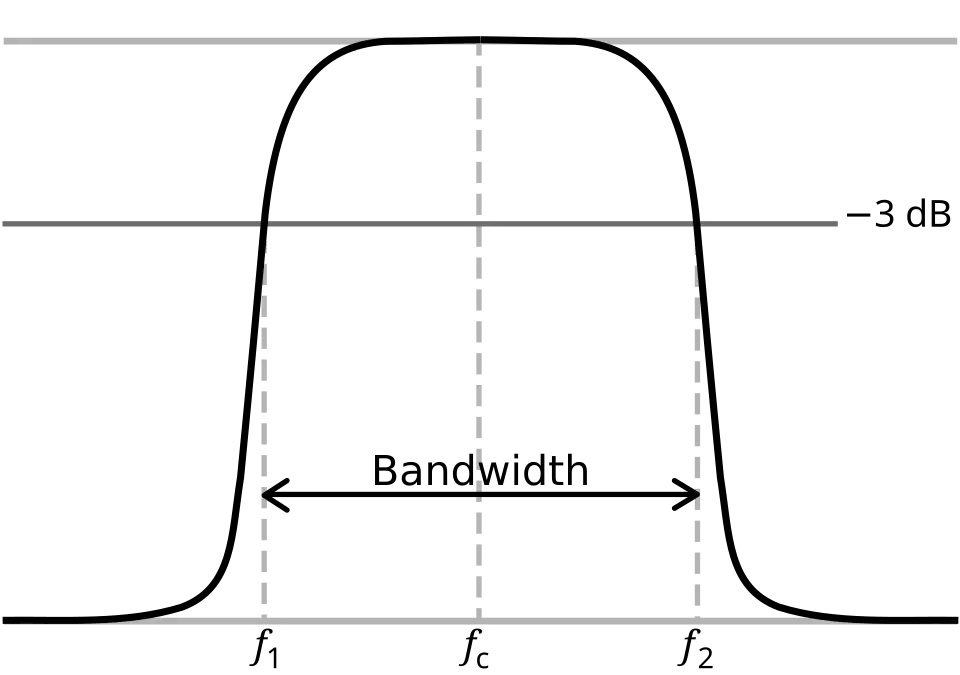A diferença entre fs e fi em um filtro passa-faixa é denominado de largura de banda:[1]