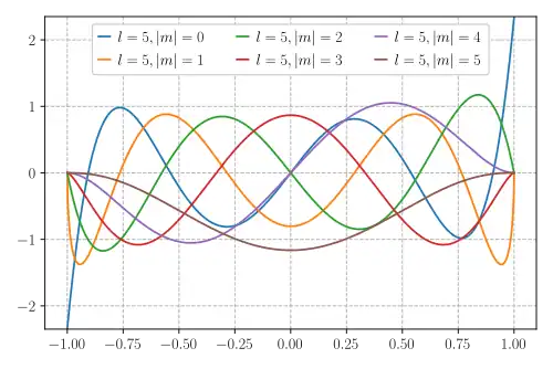 onde os números complexos λ e μ são denominados, respectivamente, grau e ordem das funções de Legendre associadas. As funções de Legendre são as funções de Legendre associadas de ordem μ=0.