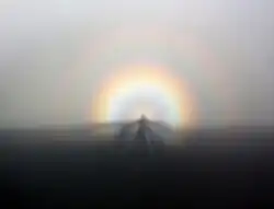 As glórias são frequentemente vistas em associação com o Espectro de Brocken, a sombra aparentemente enorme e magnificada de um observador lançada sobre a superfície de nuvens opostas ao Sol. O nome deriva de Brocken, o pico mais alto da cadeia montanhosa de Harz na Alemanha.