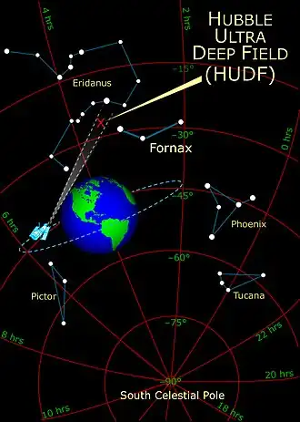 Localizado no sudoeste de Orion, no hemisfério sul, na constelação de Fornax, com uma ascensão reta de 3h 32m 40.0s e uma declinação -27° 47' 29" (J2000), a imagem cobre uma área de 11 arco-minutos quadrados (200 x 200 arco-segundos).[2] Isto é menor que um quadrado de papel de 1 mm2 situado a um metro de distância, e igual a 0,000013 (treze milionésimos) da área total do céu. A imagem está orientada de modo que o canto esquerdo superior são pontos propícios ao norte (46.4°) na esfera celeste. A estrela perto do centro da imagem do campo é USNO-A.20 0600-01400432 com magnitude aparente de 18.95.[carece de fontes]