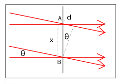 Uma forma simples de padrão de interferência é obtida se duas ondas planas da mesma frequência cruzam em ângulo. O ângulo "entre as ondas" neste caso é o ângulo entre os raios que representam a propagação das ondas, sendo que os raios são perpendiculares às frentes de onda. Interferência é essencialmente um processo de redistribuição de energia. A energia que é perdida na interferência destrutiva é recuperada na interferência construtiva. Na figura ao lado, uma onda se desloca na horizontal, e a outro está viajando para baixo segundo um ângulo θ para a primeira onda. Assumindo que as duas ondas estão em fase no ponto B, há mudanças de fase relativas ao longo do eixo x. A diferença de fase no ponto A é dada por