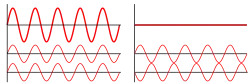 Representação de interferência entre duas ondas de mesma amplitude. No primeiro caso (esquerda) as ondas se encontram com uma diferença de fase ⲫ=0, causando uma interferência totalmente construtiva e resultando em uma onda com amplitude dobrada. No segundo caso (direita) as ondas se encontram com uma diferença de fase ⲫ= 𝜋 rad ou 180º, causando uma interferência destrutiva e a resultando em uma onda com amplitude zero.