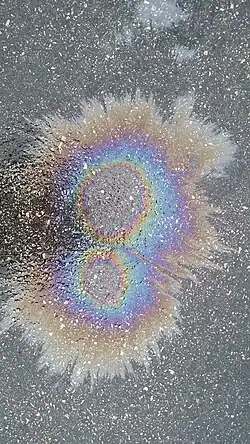 Portanto, dependendo da diferença de fase, alguns comprimentos de onda sofrem interferência destrutiva e outros comprimentos de ondas sofrem interferência construtiva, sendo possível, por exemplo, visualizar em uma mancha de óleo diversos comprimentos de ondas (cores) do espectro visível, como azul, rosa, amarelo, vermelho, roxo, etc.